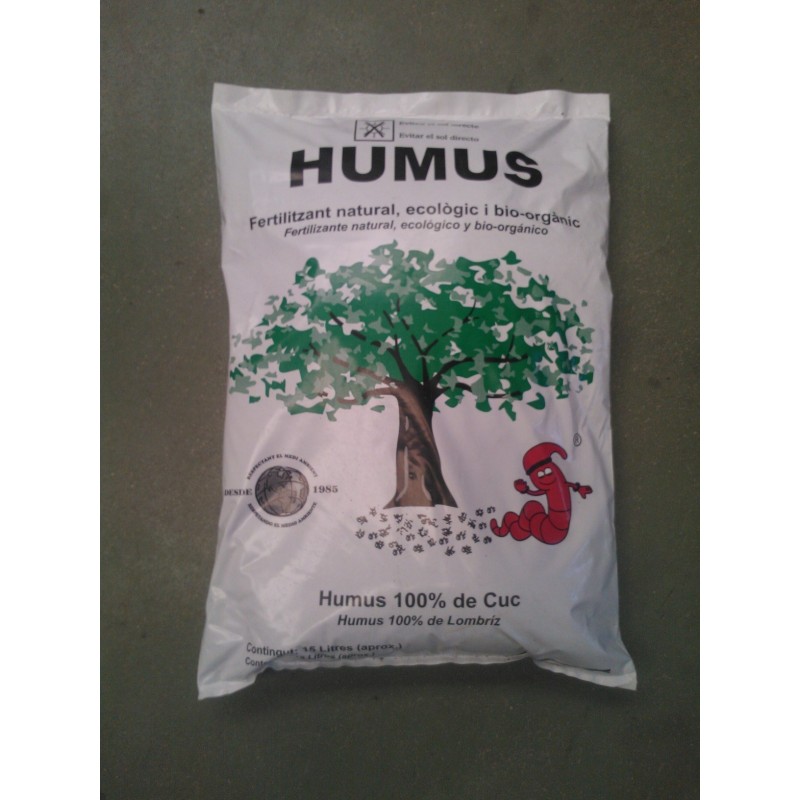El humus de lombriz es un producto de orígen orgánico, resultado de la transformación en humus del estiercol maduro de las lombrices. Se trata de un producto de alta calidad, con gran riqueza orgánica. Riquezas mínimas: extracto húmico 8%; Nitrógeno orgánico 1,1%; Fósforo total 0,7%; Potasio total 0,9%; pH 6,8-7,8; humedad màxima 40%.