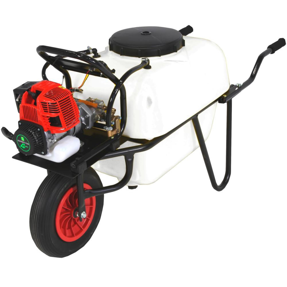 Carretilla pulverizadora de 100 litros con motor gasolina 4 Tiempos. Es ergonómica y de fácil manejo para sus 2 ruedas, ideal para fumigar frutales y huertos. Depósito de polietileno de gran resistencia. El manillar es desmontable.