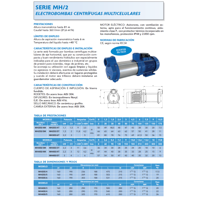 Electrobomba centrífuga multicelular de la serie MH/2 de Bomba Prinze, de eje horizontal, con 4 etapas. Por su construcción compacta y buen rendimiento hidráulico está especialmente indicada para uso doméstico e industrial en grupos de presión para viviendas y riego de jardines. Se aconseja su utilización con aguas limpias y líquidos no agresivos ni viscosos, exentos de sustancias sólidas. Su instalación deberá efectuarse en lugares protegidos. Incluye presostato PM2 para funcionamiento automático. Prestaciones: altura manométrica hasta 81 m, caudal hasta 360 l/min (21,6 m³/h), altura de aspiración hasta 6 m, temperatura del líquido hasta +40 °C. Cuerpo de aspiración e impulsión en hierro fundido. Rodetes en acero inox AISI 304. Difusores en tecnopolímero Noryl. Eje en acero inox AISI 416. Sello mecánico en cerámica y grafito. Camisa exterior en acero inox AISI 304. Motor asíncrono, ventilación externa, aislamiento clase F, protección IP44, 2.850 rpm. Certificación CE según norma IEC34. Monofásico 220V.