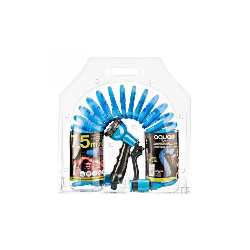 Manguera helicoidal Aquacom de 7,5 m, flexible y resistente, perfecta para riego y conducciones de agua sin enredos.