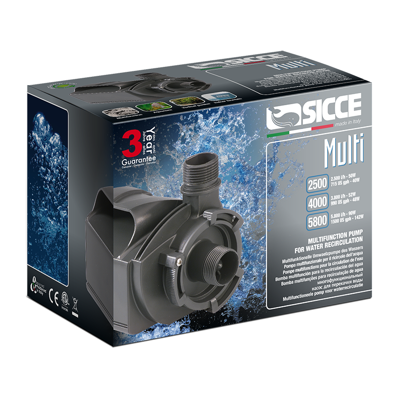 Bomba submergible de la sèrie Multi de SICCE, d'altes prestacions, dissenyada per a aplicacions sumergides i en línia. Es caracteritza pel seu funcionament silenciós i un disseny innovador i funcional. El sistema NRG és una revolució en el sector de motors síncrons d'imant permanent i permet obtenir potències excepcionals, consums reduïts, gran fiabilitat i els nivells de soroll més baixos. Cabal màxim: 2.450 l/h. Altura manomètrica: 308 cm. Pot treballar amb aigua del mar. Alimentació monofàsica 220V amb un consum de 50W. Cable d'1,5 metres. Connexió roscada IN/OUT d'1". Manilla ergonòmica per facilitar el transport i la instal·lació. Rotor amb eix de ceràmica resistent i anticorrosió, garantia de silenci màxim i fiabilitat. Inclou connectors de manguera de 20 mm, 25 mm i 1". Protecció tèrmica automàtica contra bloqueig. Accessori opcional: kit de precambra per a sistema Air Mix. Ideal per a estanys, aquaris d'aigua dolça i marina, fonts ornamentals i cultius hidropònics.