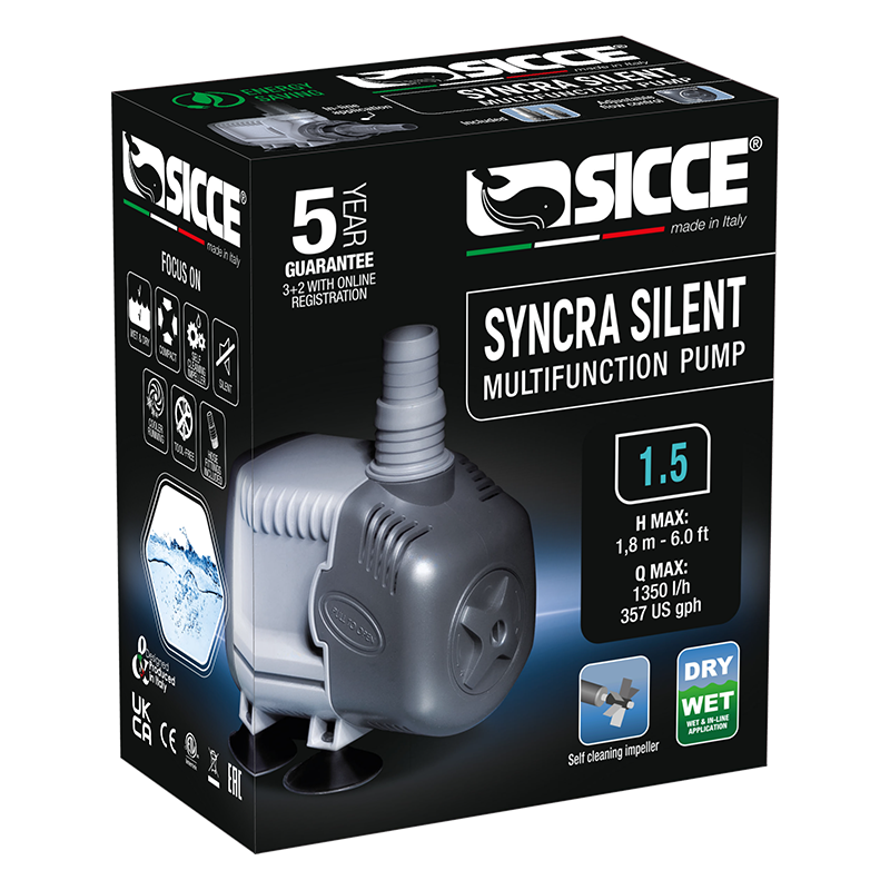 Electrobomba submergible multifunció SICCE Syncra Silent 1.5, fabricada a Itàlia, de 23W i 357 GPH (aproximadament 1.350 l/h) de cabal. Bomba de la nova generació Syncra Silent de SICCE, creada per combinar un rendiment elevat i eficiència energètica amb un silenci extrem. Potent, fiable i versàtil. Apta per a aigua dolça i salada. Inclou regulador de cabal lateral d'accionament simple i mànegues escalonades. Eix ceràmic de llarga durada. Protecció tèrmica incorporada. Disseny compacte sense necessitat d'eines per al manteniment. Ideal per a aquaris d'aigua dolça i marins, fonts interiors, refrigeració per aigua i totes les aplicacions submergibles o en línia que requereixen un alt rendiment i silenci total. Connexió monofàsica 220V.