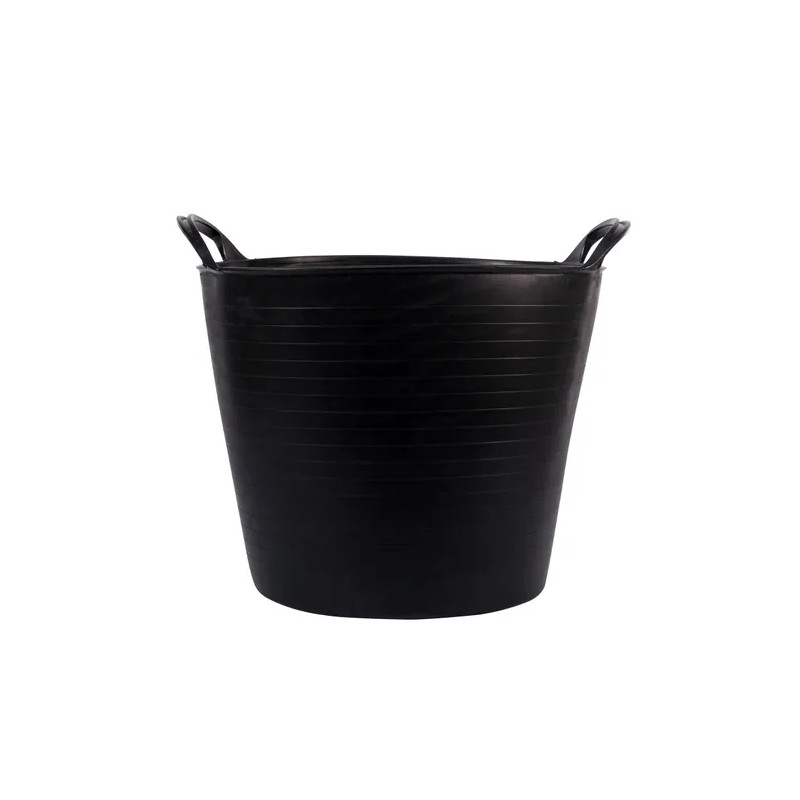 Cabàs negre de 26 litres fabricat en plàstic reciclat, resistent i flexible. Amb rebarba a la part inferior per abocar el contingut amb més facilitat. Especialment indicat per a agricultura i totes les aplicacions en general. Disposa de 2 nanses extragrandes reforçades, preparades per treballar amb guants i per transportar la càrrega còmodament. Molt resistent i de gran durabilitat. Dimensions aproximades: Ø 36 x 30 cm d'alçada. Ideal per a jardineria, recol·lecció, ramaderia, construcció i ús domèstic en general.