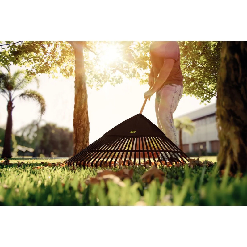 Escombra de jardí de plàstic amb cap de polipropilè d'alta resistència, disseny flexible i lleuger, amb 30 dents planes per recollir fulles i restes de gespa. La seva construcció en plàstic la fa especialment resistent a la corrosió i als agents climàtics, ideal per a ús en exterior. Les pues planes permeten un treball suau sobre el césped sense danyar-lo. Amplada de capçal aproximada: 50 cm. Compatible amb mànec estàndard (no inclòs).