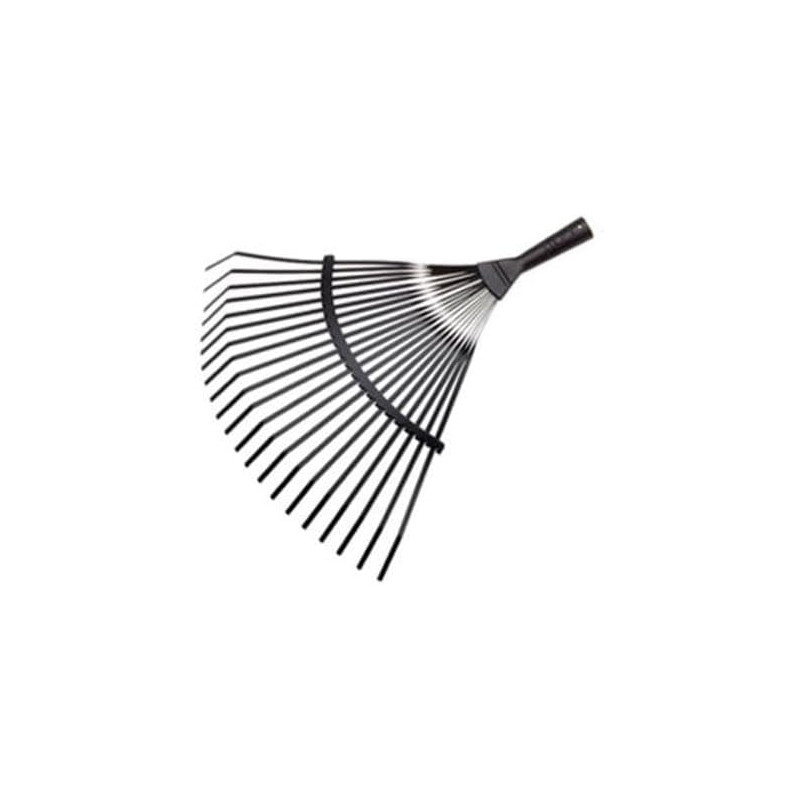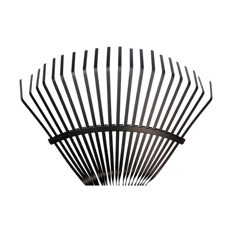 Escombra de jardí amb pues planes d'acer d'alta qualitat amb tractament tèrmic a les varetes per evitar deformacions i màxima resistència a la flexió. Amplada de 385 mm i llargada de 420 mm. Pes de 440 grams. Apropiada per a la neteja del césped, tant de restes d'herba tallada com de fulles o residus. Robusta i que no es deforma. Les pues planes d'acer d'alta qualitat amb tractament tèrmic la fan resistent a la flexió i ajuden en la neteja del césped tallat, les fulles i els residus sense danyar el césped. Compatible amb mànecs de fusta FSC o d'alumini (no inclòs).